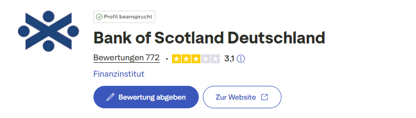 Uns liegen keine Erfahrungsberichte über Umschuldungen vor, die bei der Bank of Scotland vorgenommen wurden. Auf dem Portal Trustpilot.com verfügt die Bank of Scotland über insgesamt 772 Bewertungen und Erfahrungsberichte und eine akzeptable Gesamtnote von 3,1.
