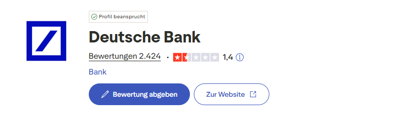 Uns liegen keine Erfahrungsberichte darüber vor wie gut der Deutsche Bank Kredit bewertet wird. Die Deutsche Bank verfügt auf dem Portal Trustpilot.com über insgesamt 2424 Bewertungen und Erfahrungsberichte.