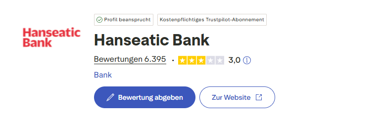 Die Hanseatic Bank selbst verfügt auf Trustpilot.com über insgesamt 6.395 Bewertungen und Erfahrungsberichte und eine akzeptable Note von 3,0.