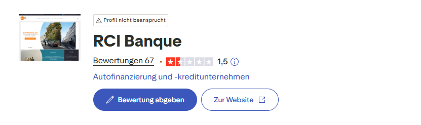 Die RCI Banque verfügt auf Trustpilot.com über insgesamt 67 Bewertungen und die ungenügende Note 1,5. Die Bank hat ihr Profil dort nicht beansprucht.