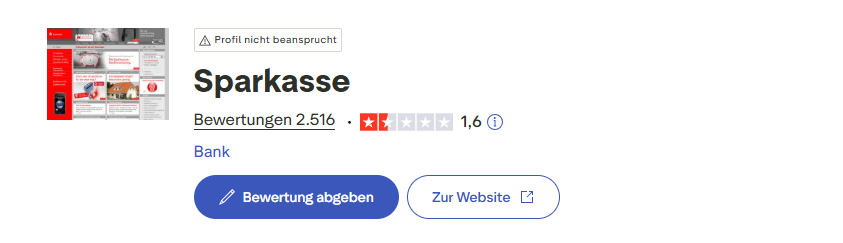 Die Sparkasse selbst kommt auf 2.516 Bewertungen und Erfahrungsberichte und nur eine ungenügende Note von 1,6. Dazu muss man sagen, dass jede Sparkasse unterschiedlich ist und es hier nicht möglich ist „die Sparkasse als Ganzes“ zu bewerten.